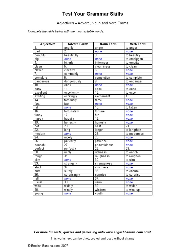 The present participle of the verb, used as a noun. Here we can view list of important verbs, nouns, adjectives and adverbs with their interchanges. Or do you mean 'are there any words which can be used as a noun, an adjective and a verb?' ? Here, you will find a huge list of verbs, nouns, adjectives and adverbs with the added prefixes and suffixes for the modification. Nouns with latin or greek endings and nouns that look plural but sometimes take singular verbs can cause agreement problems. There are several pairs of nouns and verbs in english that are spelled the same way, but have different pronunciation due to a difference in stress placement. In the following example, criteria is plural. This website provides basic instruction in nouns, pronouns, verbs, adjectives, adverbs, prepositions. For a few verbs, the past tense form is spelled or pronounced the same as the bare form. Noun refers to a person, place, object or concept. The difference between nouns and verbs. Nouns and verbs are two of the major categories of parts of speech. As we know, nouns are naming words and verbs are doing words.